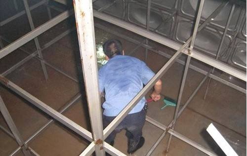 带有爬梯的水箱可沿爬梯爬入水箱内,不带爬梯的水箱则可用竹梯2个(高度适中)分别架于水箱内、外侧,在有人保护的情况下就可沿竹梯进入水箱;